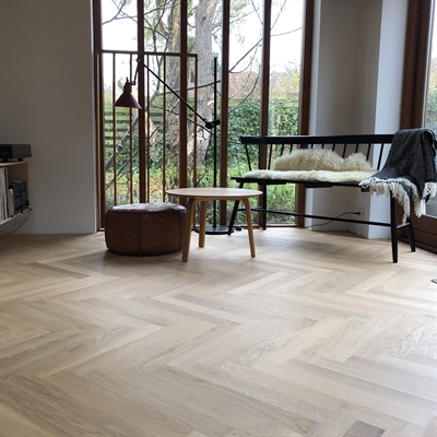 Laminert Fiskebeinsparkett i utvalgt utgave uten kvister og vakker ensrettet farge.