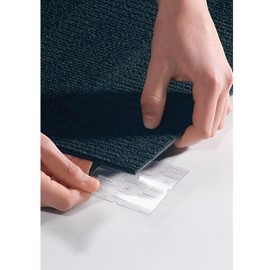 Enkel montering med TacTiles, som er en spesialtape i firkanter på 7,5 x 7,5 cm. Hvert hjørne av teppeflisen limes fast på teipen. Teipen er en effektiv og kjapp metode til montering av teppefliser. 5 stk bånd brukes per m2 fliser. TacTiles medfølger ikke.